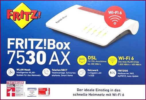 Lieferumfang: 1x FRITZ!Box 7530 AX, 1x Netzteil, 1x 4 m langes DSL-Anschlusskabel, 1x 1,5 m langes LAN-Kabel, 1x Installationsanleitung